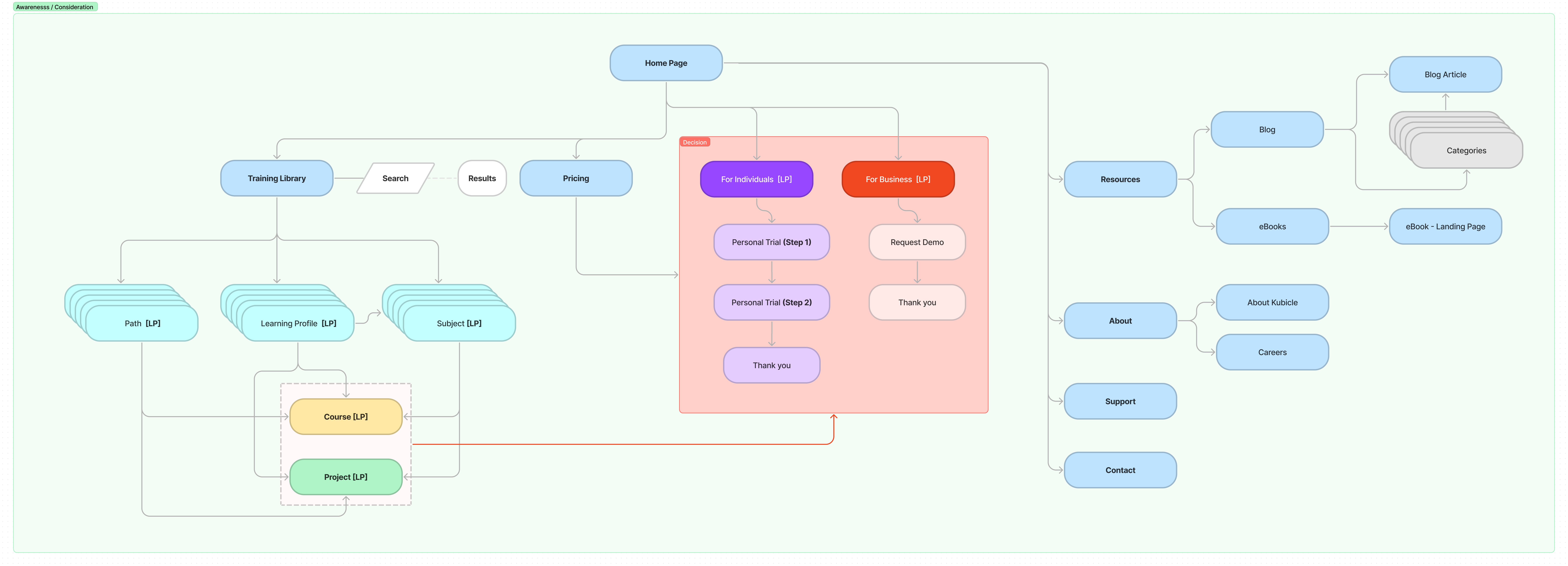The user flows were restructured considering the role of each page along the conversion funnel, being divided into awareness, consideration and decision phases.